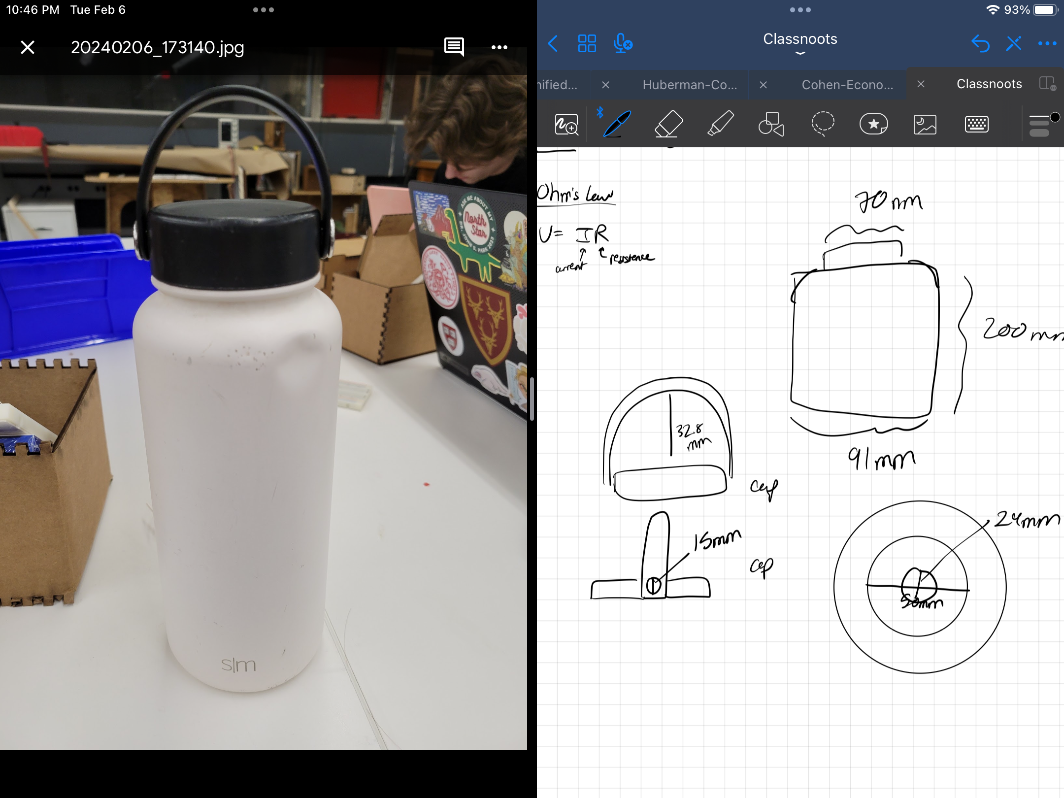 To create this model, I divided the water bottle into 3 parts: the bottle, the lid, and the handle. Below are sketches of the components:
