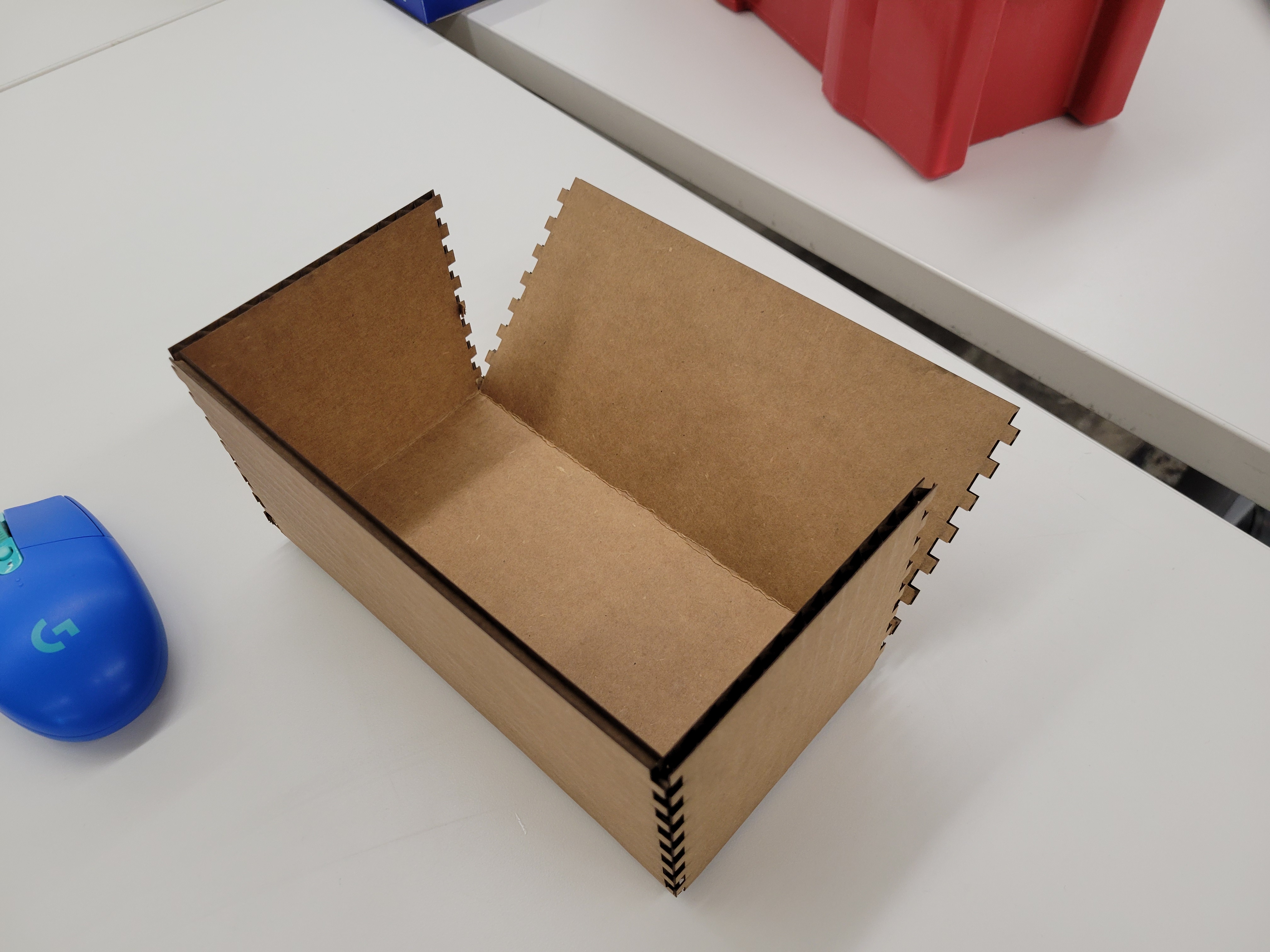 one idea to improve the structural integrity of the cardboard is to cut the box at an angle to offset the teeth problem. For future iterations of the box!
