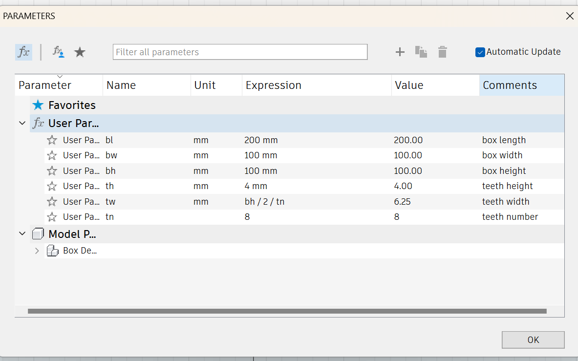 Modeling this box out utilizing parameters and patterns was more difficult than expected. I realized that oftentimes, the patterns I would create would have overlapping lines that would later tell the laser cutter to cut the line multiple times, messing up the design. I also had a lot of troubleshooting as to which parametric measurements should be relative to one another -- for instance, the spacing was relative to the width of the teeth so that the teeth would eventually interlock. Here are the parameters I used for my box: