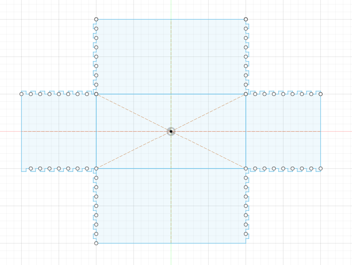 For the second part of the assignment, we were tasked with building a box from laser cut cardboard. This involved use of patterns, parametrics, and troubleshooting with physical hardware (the laser cutter and the cardboard itself) and was more challenging than expected. I started off by making a 2d sketch of the box laid out: