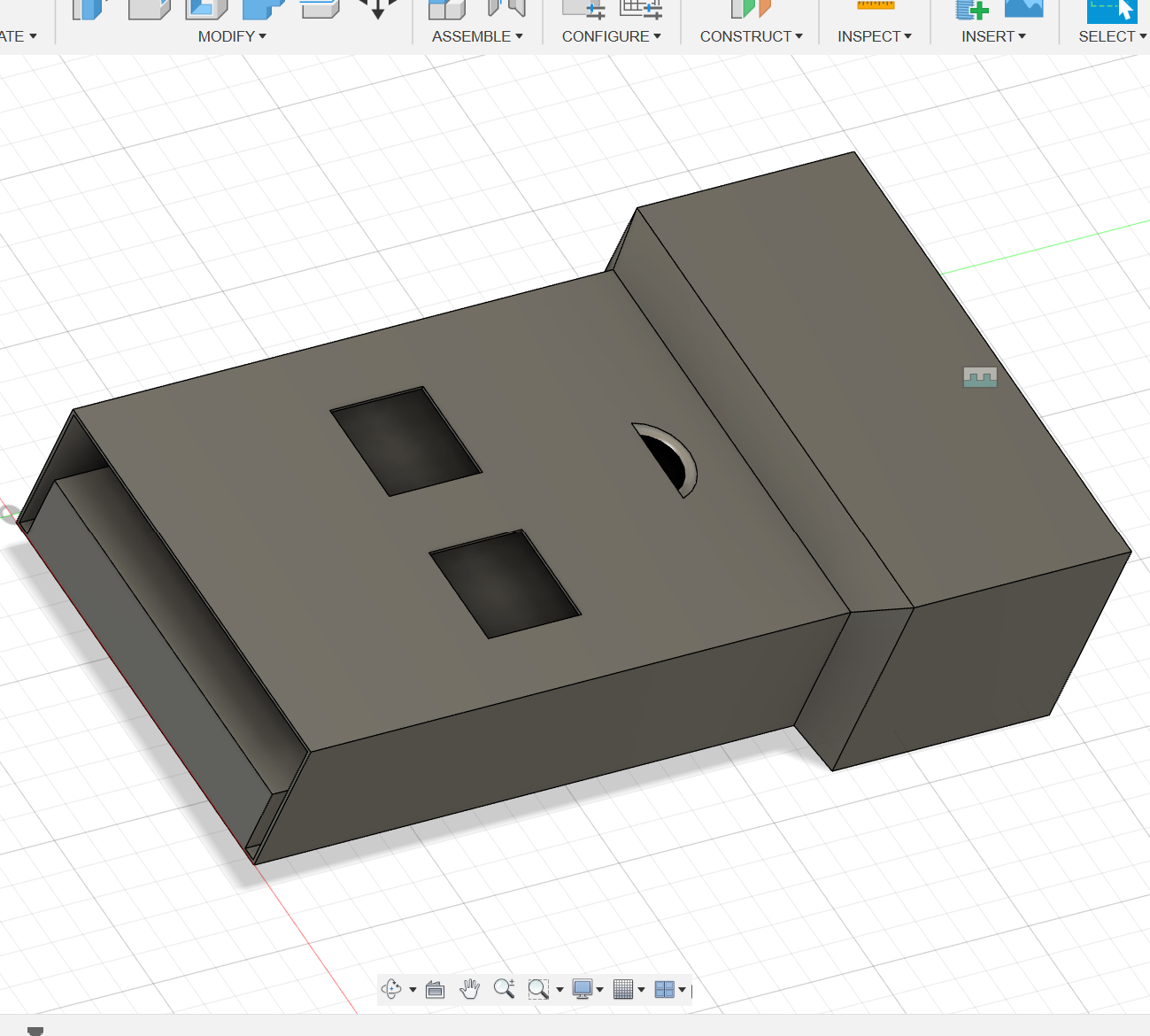 To design this, I split it into two parts, the USB itself, and the plastic bit that goes on the end. Compared to the water bottle, the joint for this was a lot simpler since it didn't have to move and was relatively straight forward in placement.