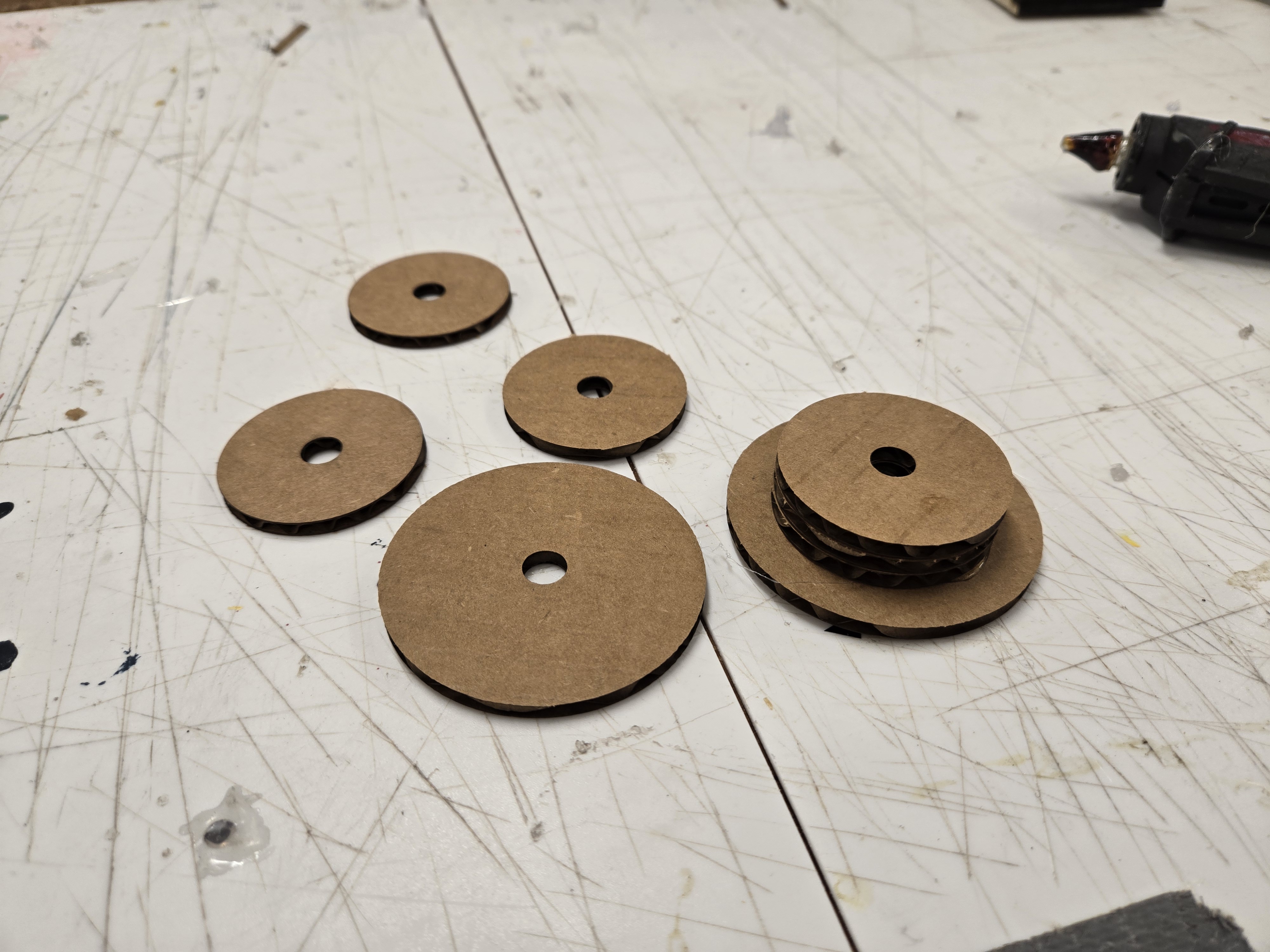 When it came to the wheels that would drive the mechanism, I opted to use laser cut pieces of cardboard. This was because the gears would be light and easy to turn, and would not take 5 hours per gear to 3d print (unfortunately this use of cardboard created issues that you will see very soon).