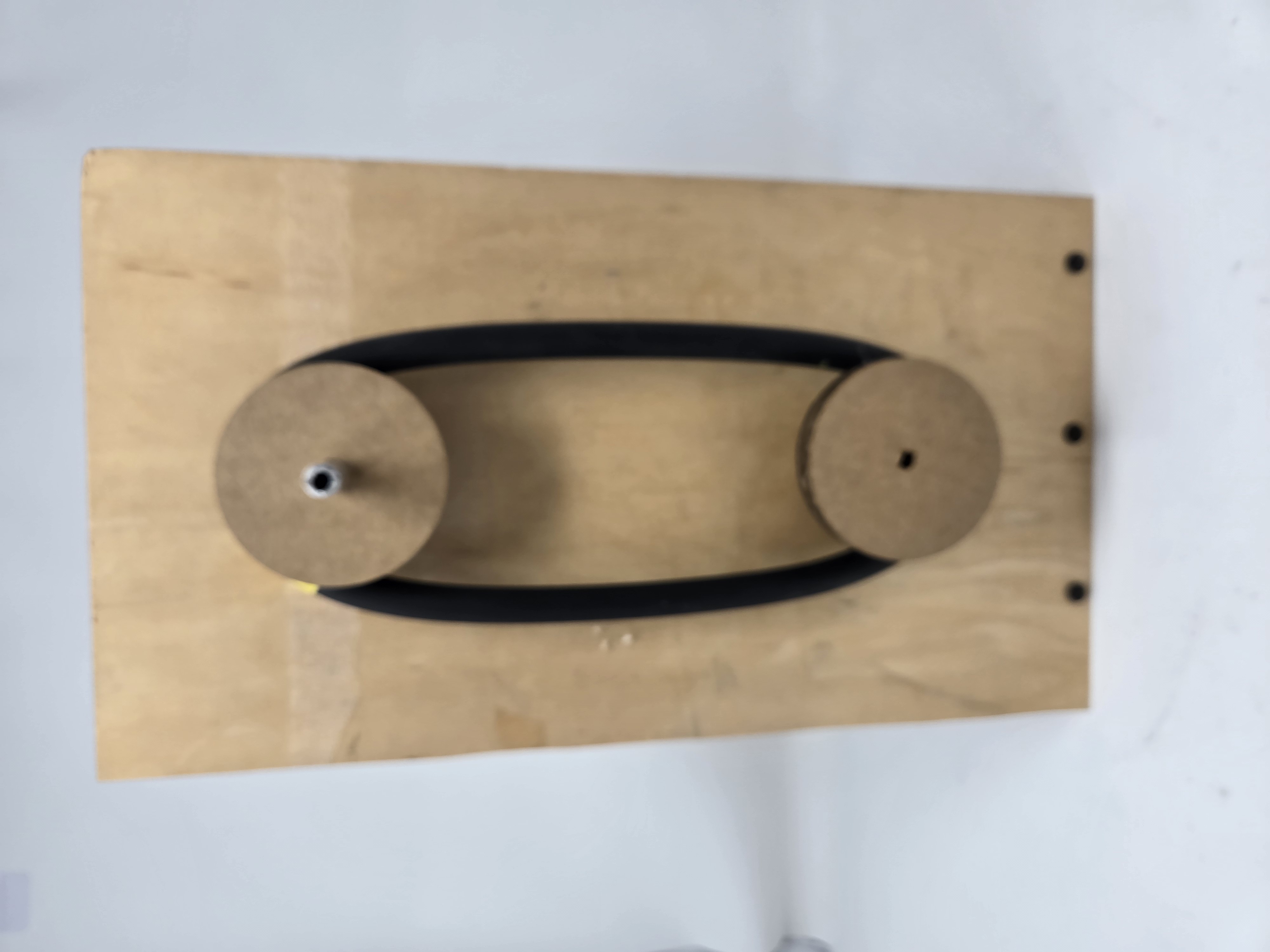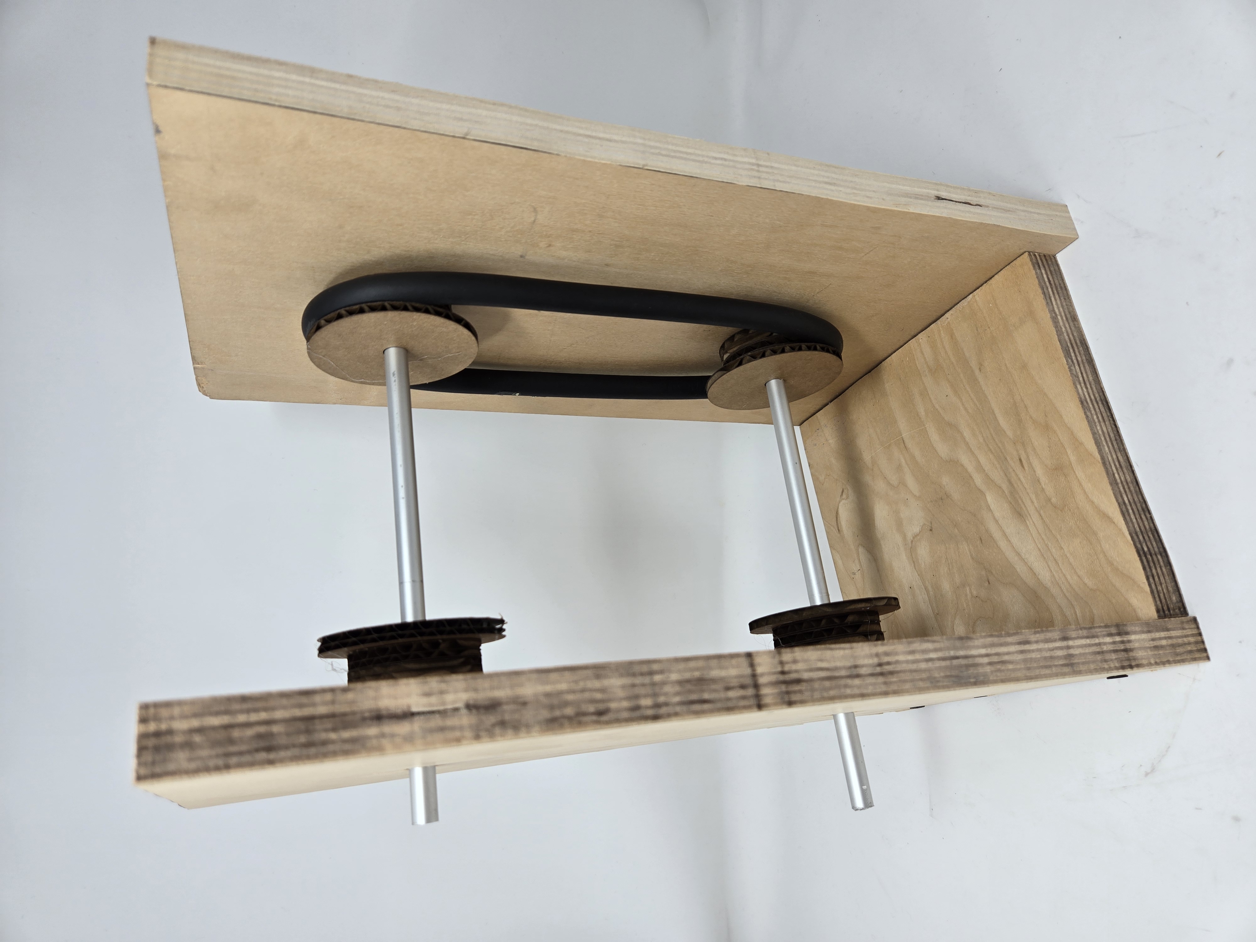 As you can see, the model works! I made a small box for the motor and the board to sit on during operation. The motor drives the bottom wheel, which is then connected to the other four wheels to turn the entire structure and drive the two belts.