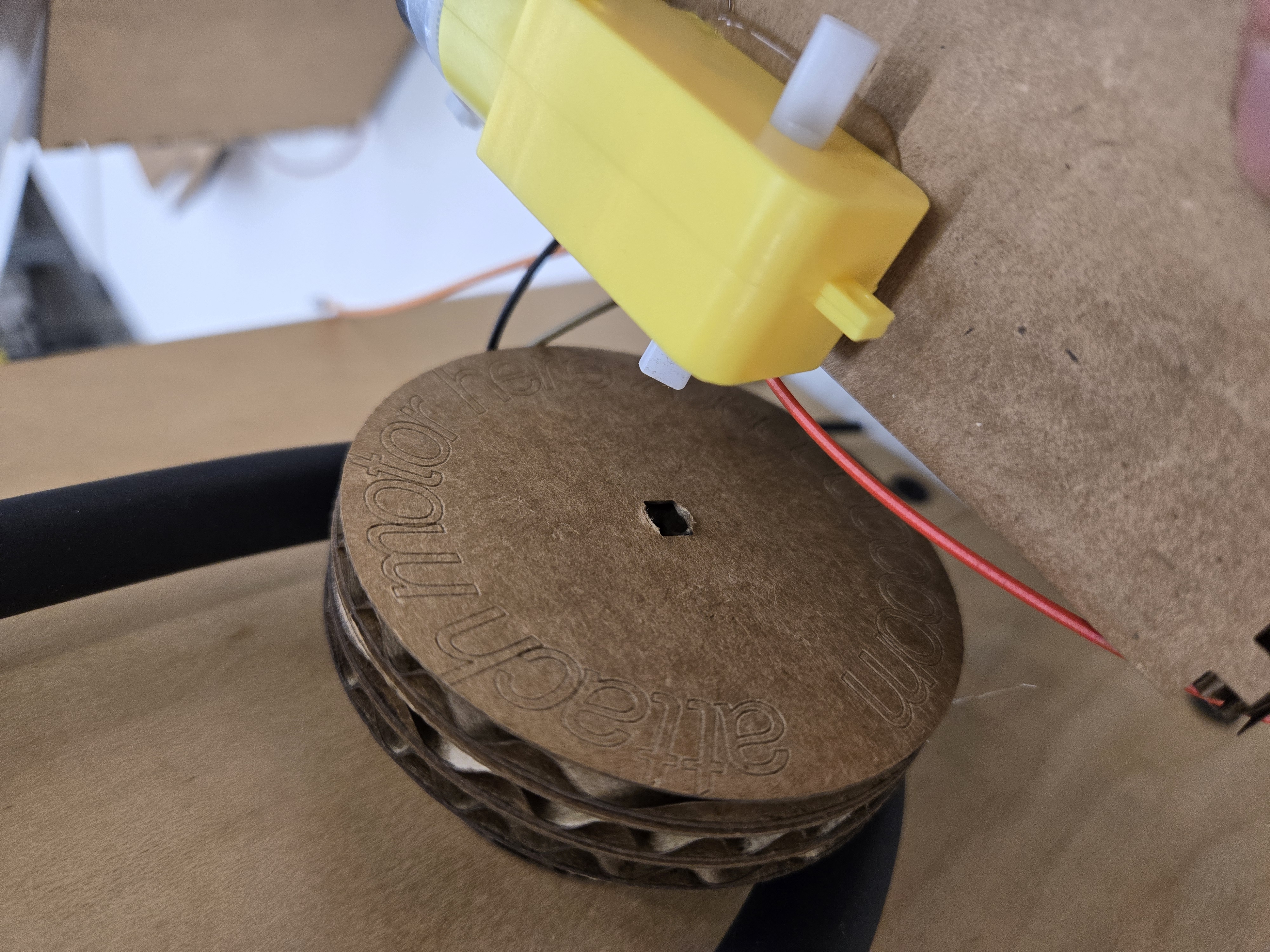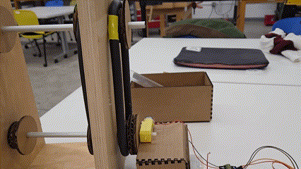 However, after taking that video, the post on the motor had stripped the cardboard holding mechanism that connected the motor to the mechanism. The combined strength of the motor and the amount of power required to drive the mechanism was all concentrated in the maluable cardboard and ultimately caused the mechanism to become stripped. In future iterations, I will probably end up 3D printing the gears and hopefully not have this issue.