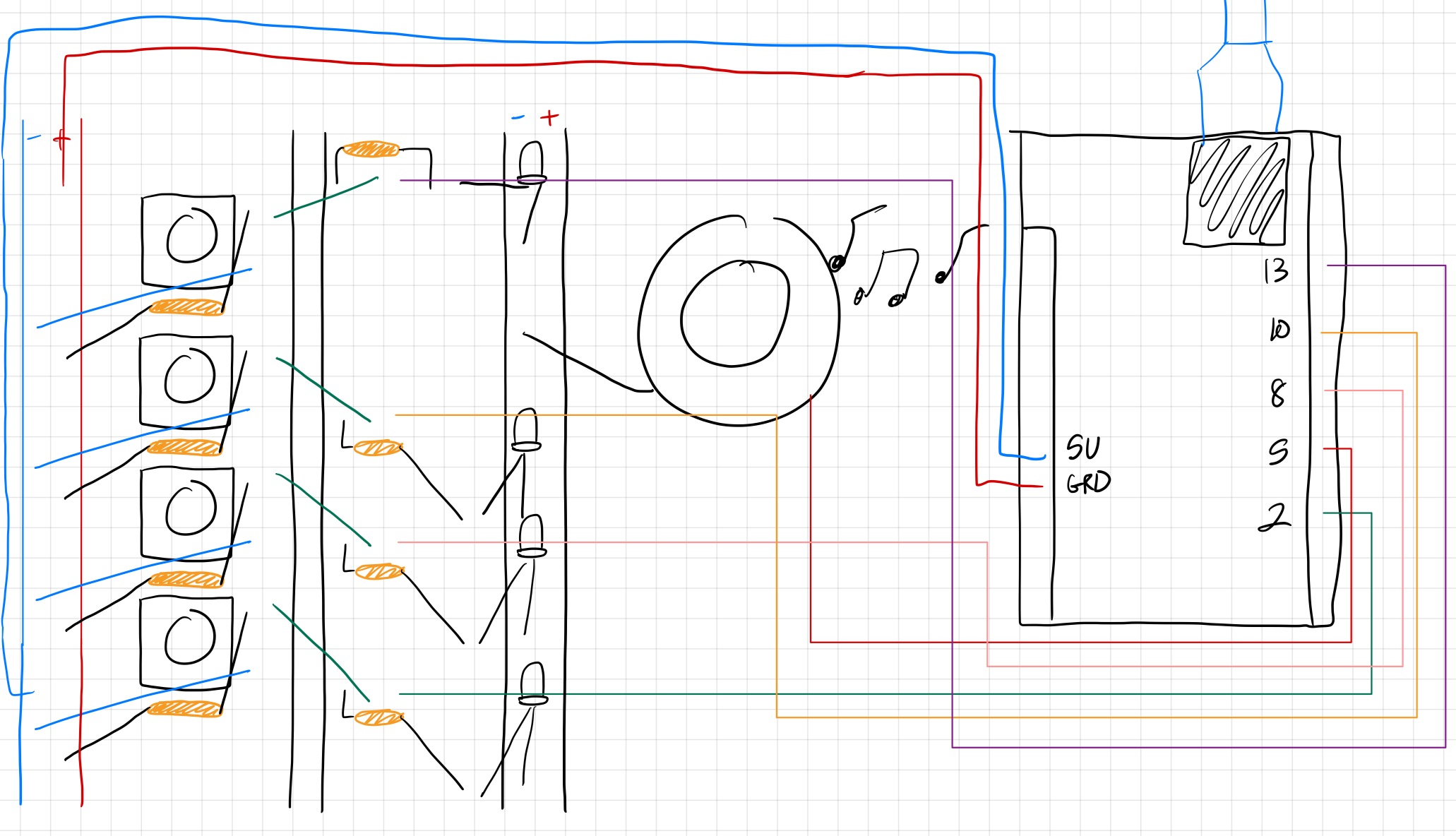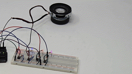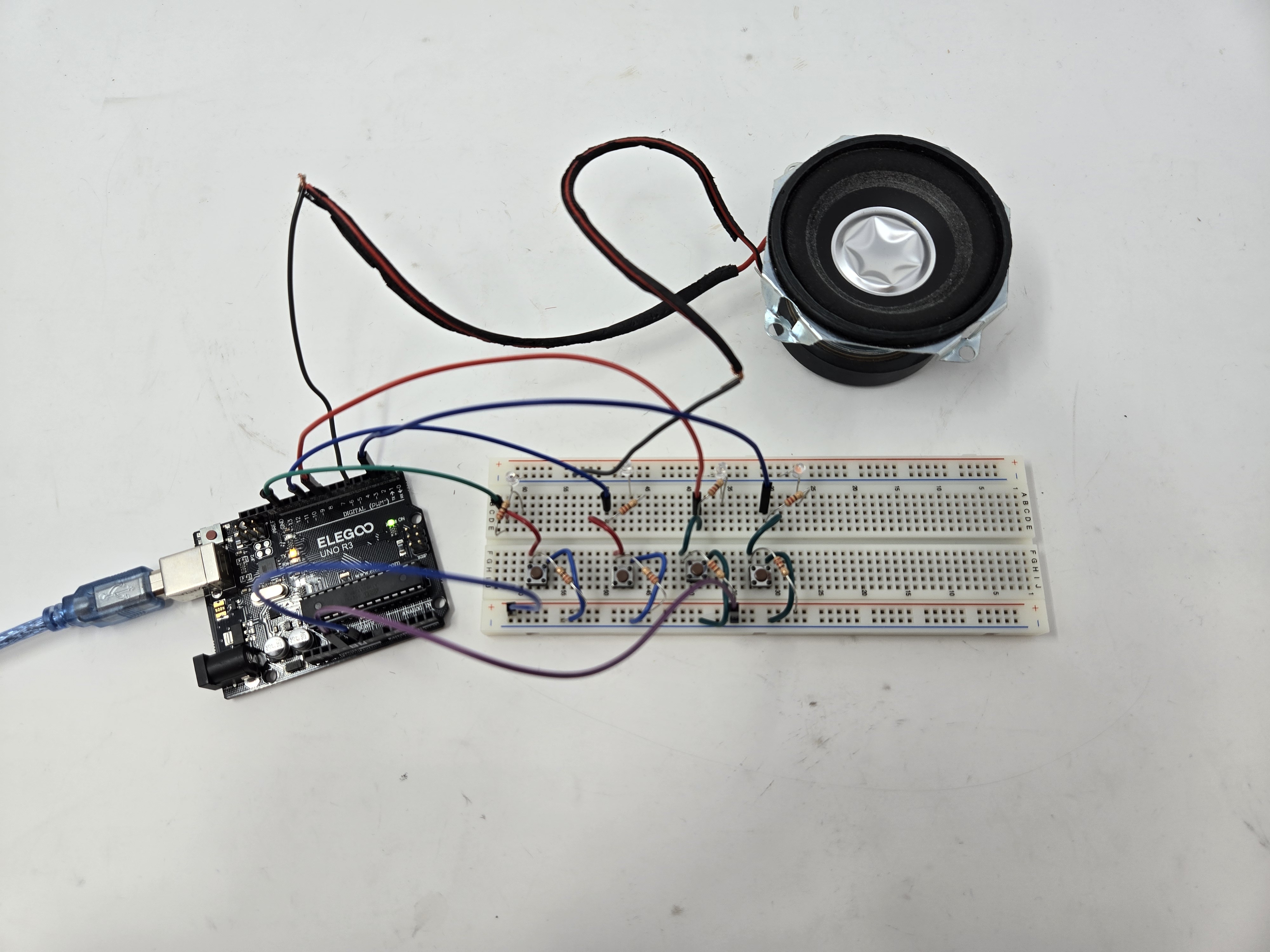 Each button is connected to a resistor, which is then in series with the LED that is plugged into the Arduino controller with the appropriate digital controller pins and to the ground + power. The assembly is identical down the line, with the exception of the speaker, which required me to rearrange the top button-resistor-LED assembly to accomodate it in the breadboard.