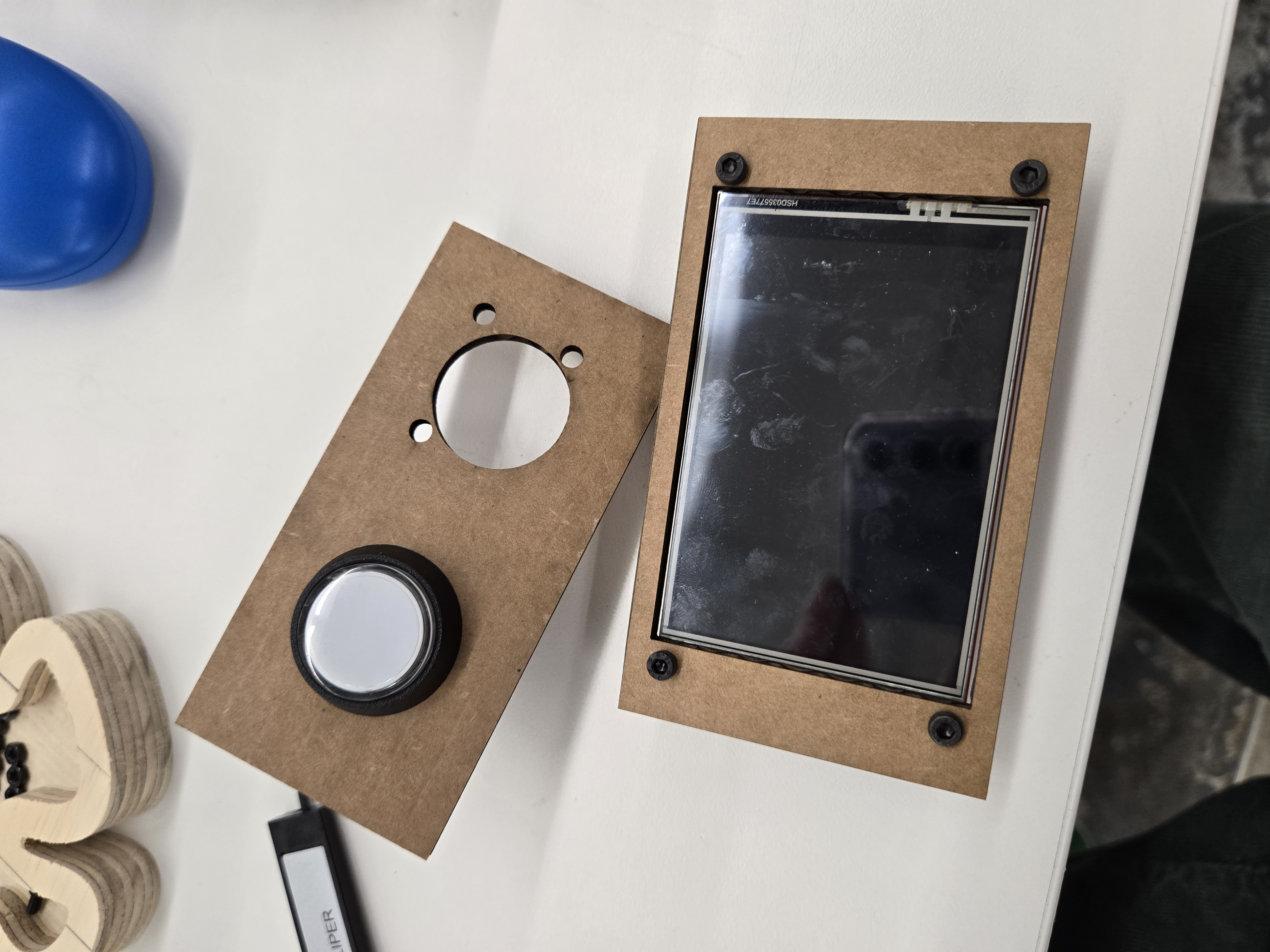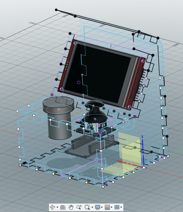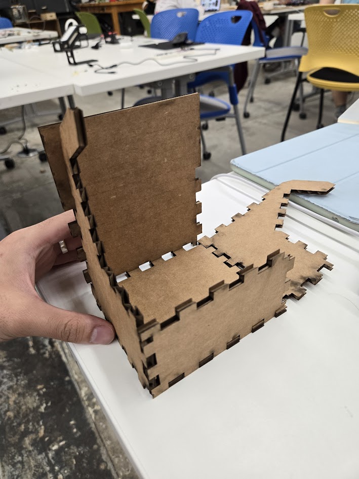 After getting the screen to successfully work, I started to design the housing for the cabinet. I wanted to avoid 3d printing as much as possible because prototypes take significantly longer than laser cuts and are sometimes not as strong. To get a good sense of how the brain (the parts) would fit into the body, I modeled and cut out a few test cuts to see how precise the placement of the holes needed to be to accommodate the parts I wanted to use. When I cut the parts out of cardboard, the tolerances were surprisingly tight, so I was able to model the housing pretty close to the measurements of the parts.