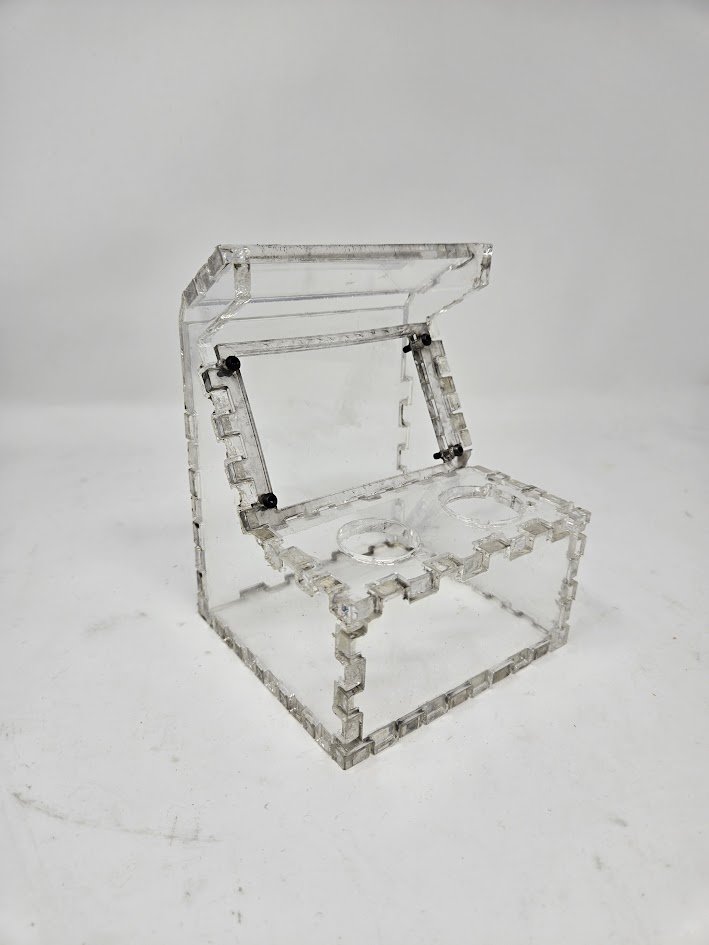 Finally, it was time to put it all together. First, I test fit all the parts into the housing. While the cardboard parts had fit earlier, some of the imperfections in the laser cut caused some of the elements not to fit correctly. As a result, I had to recut a couple pieces and ended up cracking a few while trying to remove them from the acrylic. Once all the components fit, I ran a quick test program with the components off the breadboard to test if they worked: