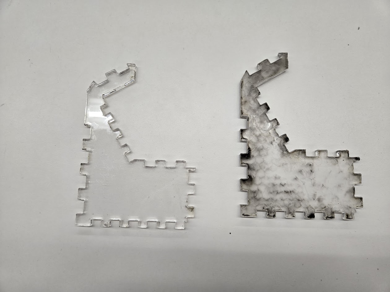 The next step was cutting the pieces out of clear acrylic. This presented its own set of issues – the plastic would often melt in unexpected ways and the pieces would warp after the cut. Furthermore, the laser residue would get on the pieces and cause it to become cloudy and have a permanent burnt look. While this is an aesthetic for some, I wanted to have a clear cabinet. I found that by cutting the acrylic with the protective film on top, I was able to get a much cleaner cut.