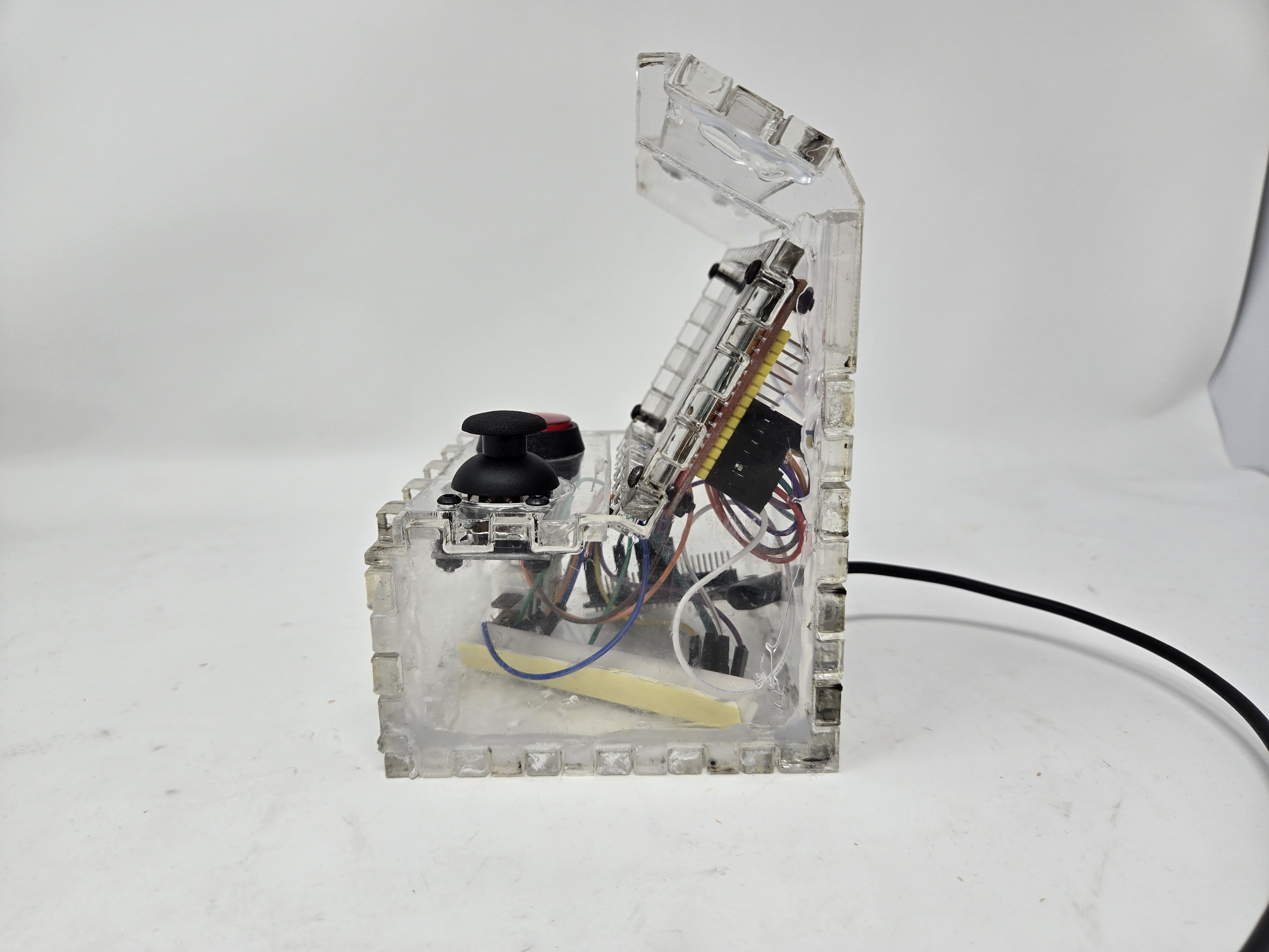 After all the components worked together, I put the whole thing together and marveled at how well it turned out. After a few tries the housing was perfect and I was really happy with how the transparent panels showed off all the electronics inside. I also used a big red button from a larger array of buttons to reset the game. And because it looks awesome. Here are some nice product shots of the cabinet: